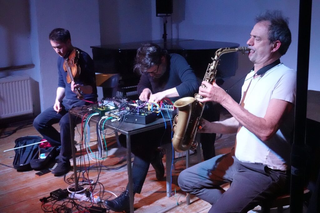 In der zweiten Halbzeit wirft sich der Franose Jean-Luc Guionnet im Teatro Tetrix mit den beiden Schweizern Frantz Loriot (Viola) und Gaudenz Badrutt (Elektronik) ins subkutan brodelnde Getümmel. Der andernorts außerordentlich physisch bzw. muskulös agierende Altsaxofonist reduziert sich in dieser Kooperation auf wenige, still vor sich hingeblasene Kürzel und auf lang anhaltende Klangbotschaften. Loriot bratscht zart und dennoch auf den Punkt, Badrutt grundiert die Entschleunigung häufig mit weit unten angesiedelten Drones. In den besten Momenten, und derer gibt es an diesem Abend en masse, klingen die Sounds der drei wie Stimmen aus dem Jenseits, die ihr Leben bilanzieren und miteinander vergleichen. Das könnte von mir aus noch stundenlang so weitergehen, muss aber aus gewöhnlichen Gründen nach nicht einmal einer Stunde enden. Schade aber magnifique!