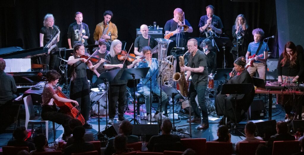 Es wäre unfair, aus diesem unfassbaren Kollektiv Einzelleistungen hervorzuheben. Dennoch geraten die Beiträge von Mariá Portugal, sowohl an den Drums als auch vokal, von Mats Aleklint an der Posaune, der Trompeterin Lina Allemano, der Sängerin Sofia Jernberg, der Cellistin Emily Wittbrodt und der Turntablistin Mariam Rezaei besonders grandios. Schwer wiegt auch eine Komposition bzw. Impro-Anleitung von Mette Ramussen. In Summe ein Abend, der ohne Superlativ unmöglich zu bilanzieren ist: ein spätes Konzert des Jahres!